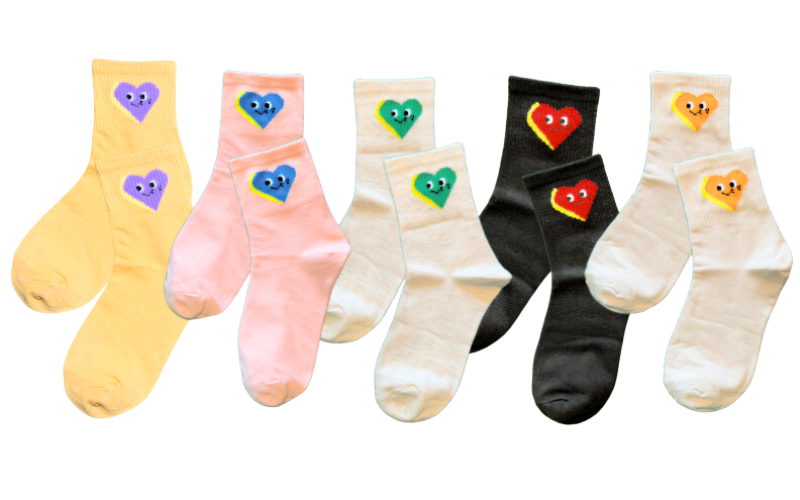 Show off your heart with this pack of 4 mid-calf socks, featuring lovely heart patterns in black, pink, grey, and yellow. Fun, fashionable, and perfect for any occasion.
